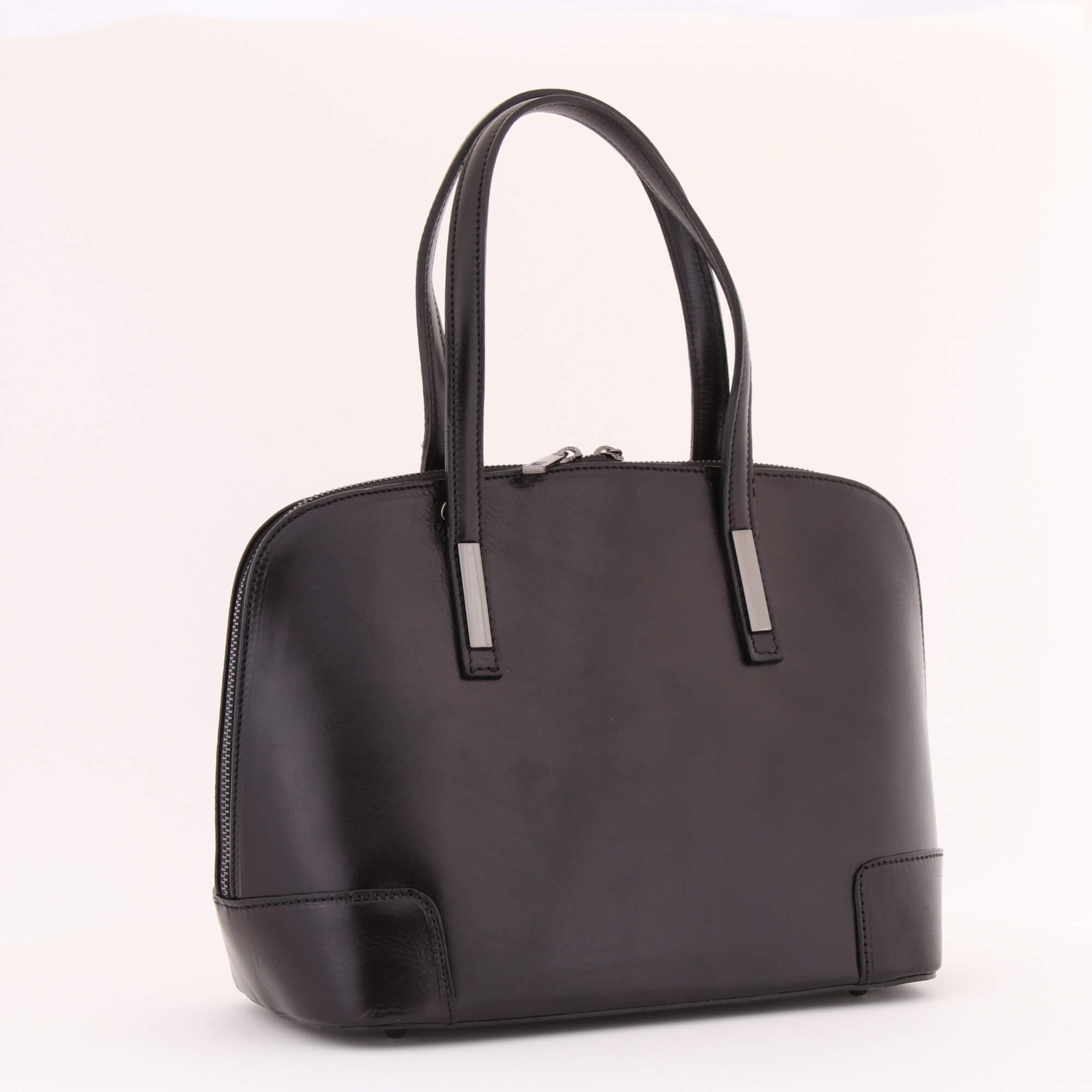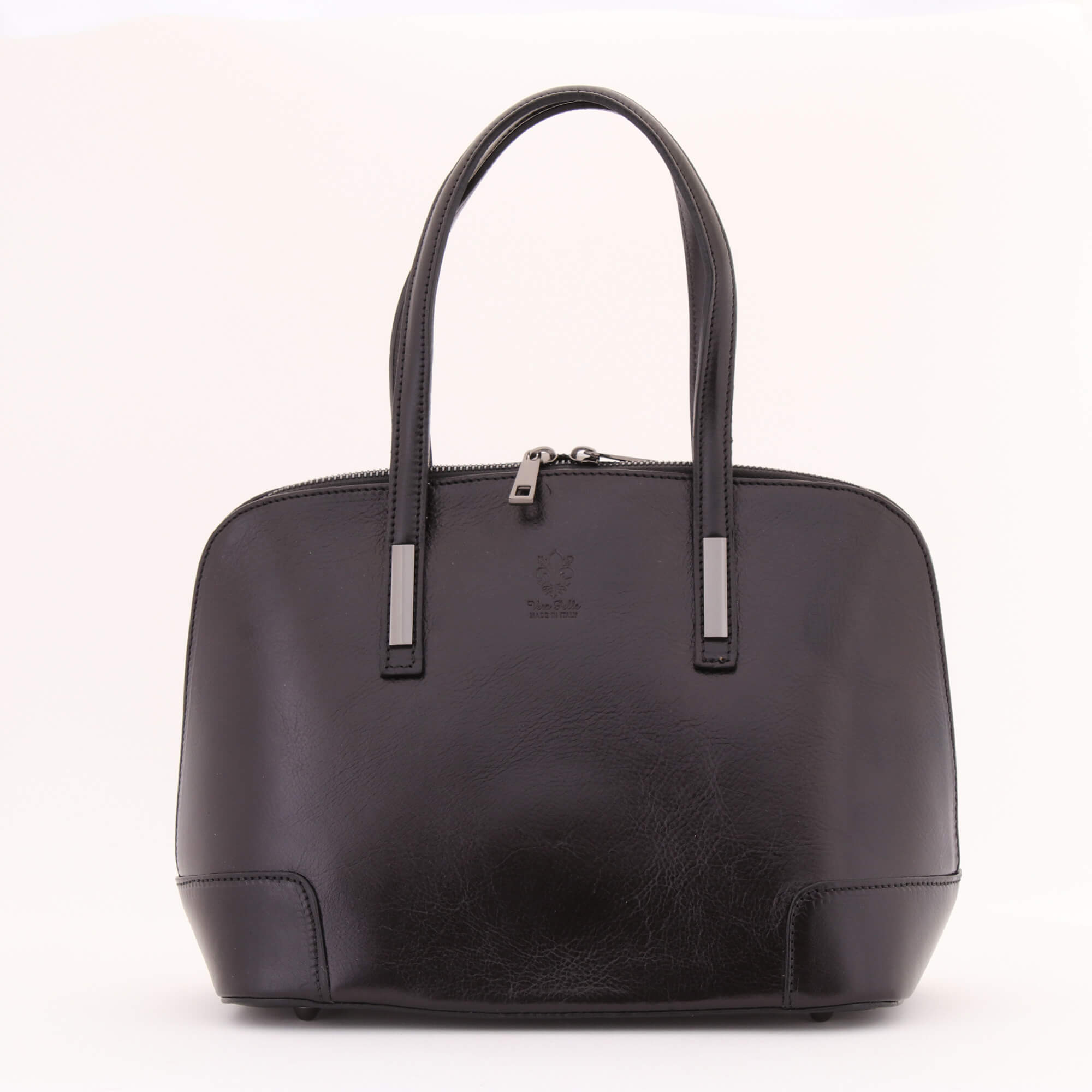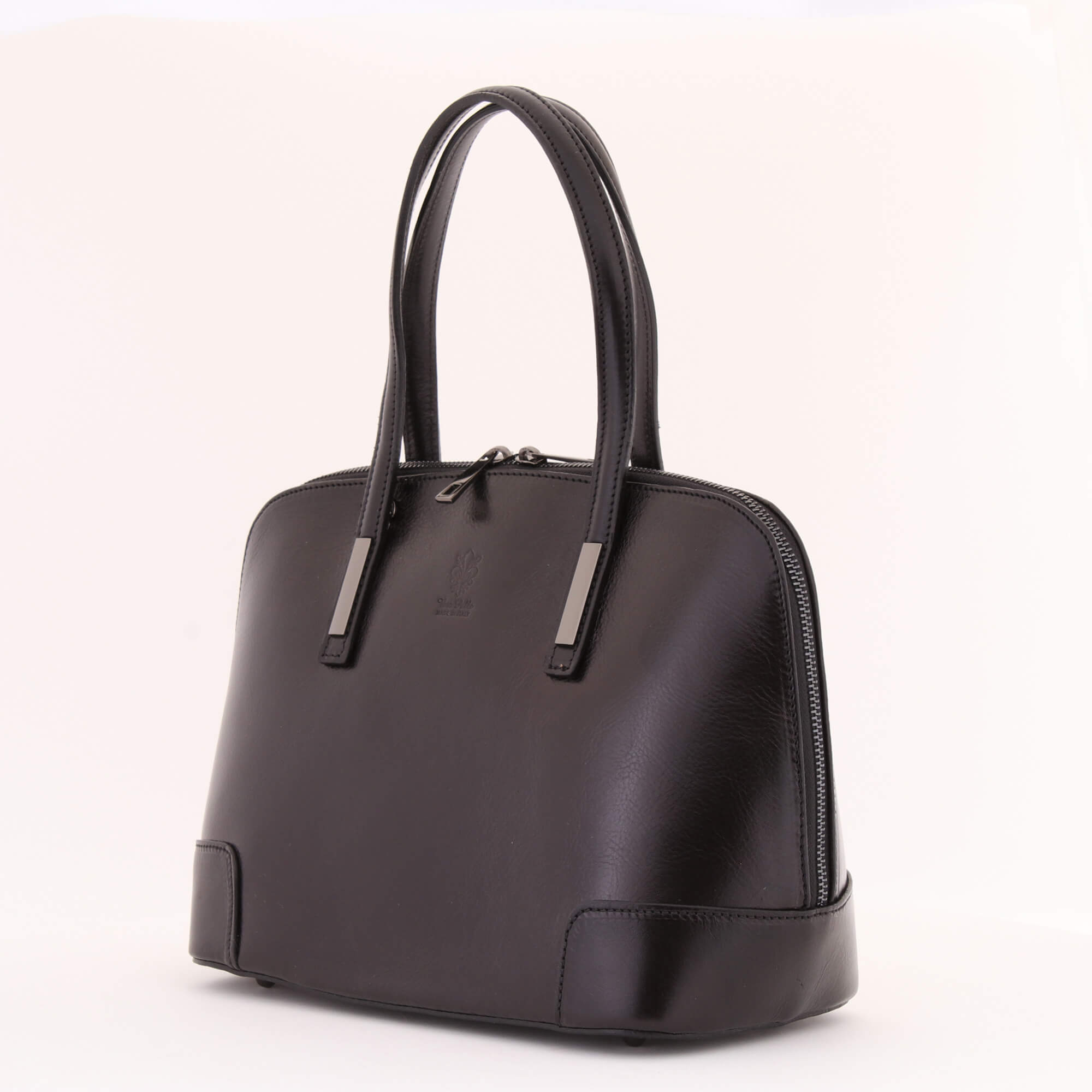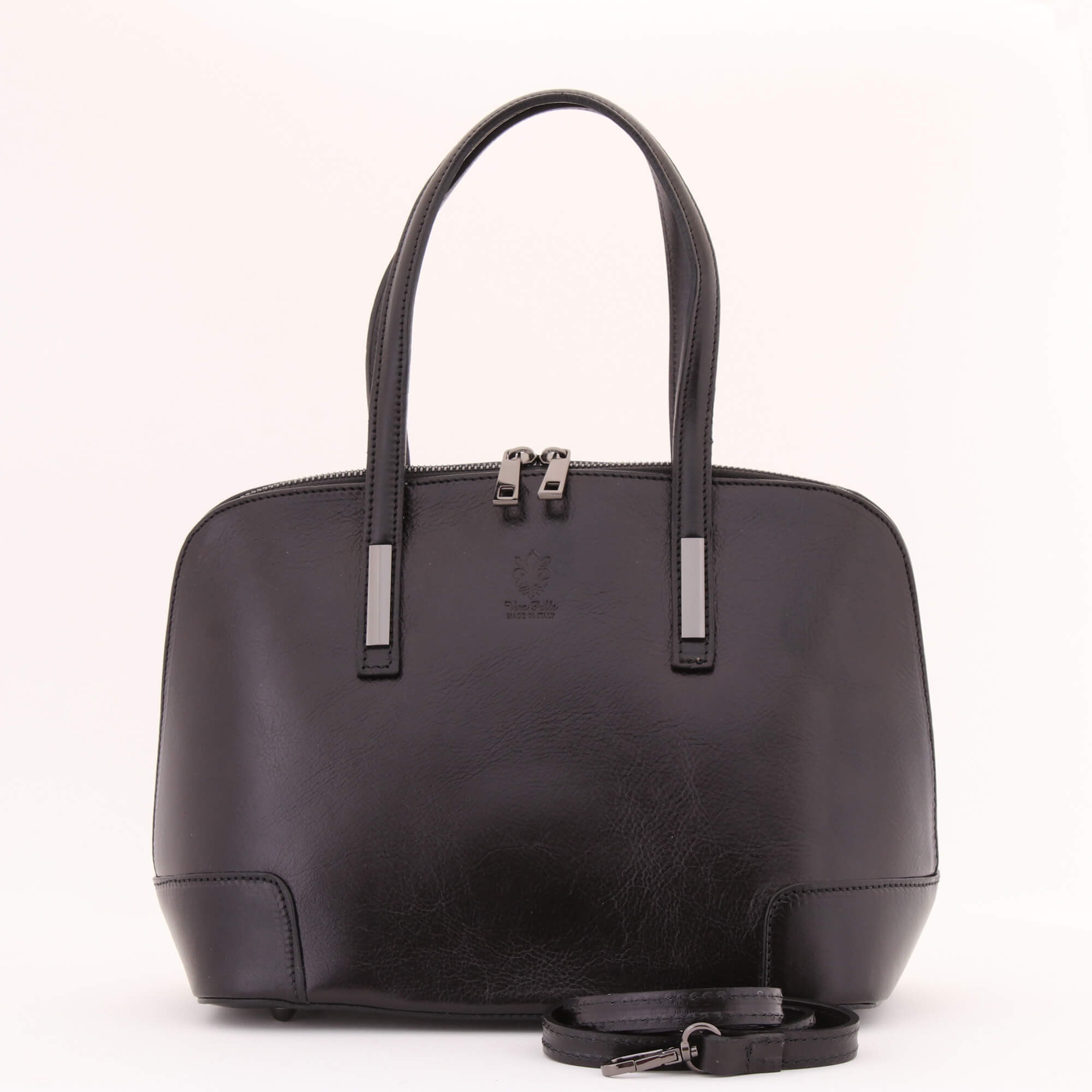 Met deze chique zwarte damestas komt u pas echt goed voor de dag tijdens een afspraak of dagje uit. Gemaakt van het kwaliteitsleer waar Italië bekend om staat. Dit model heeft een elegante vorm en is voorzien siermetalen details. Met het bijgeleverde riempje kunt dit product tevens al schoudertasje dragen. Voorzien van een crèmekleurige voering met twee extra binnenvakjes. Volledig afsluitbaar met duurzame spiraalrits.