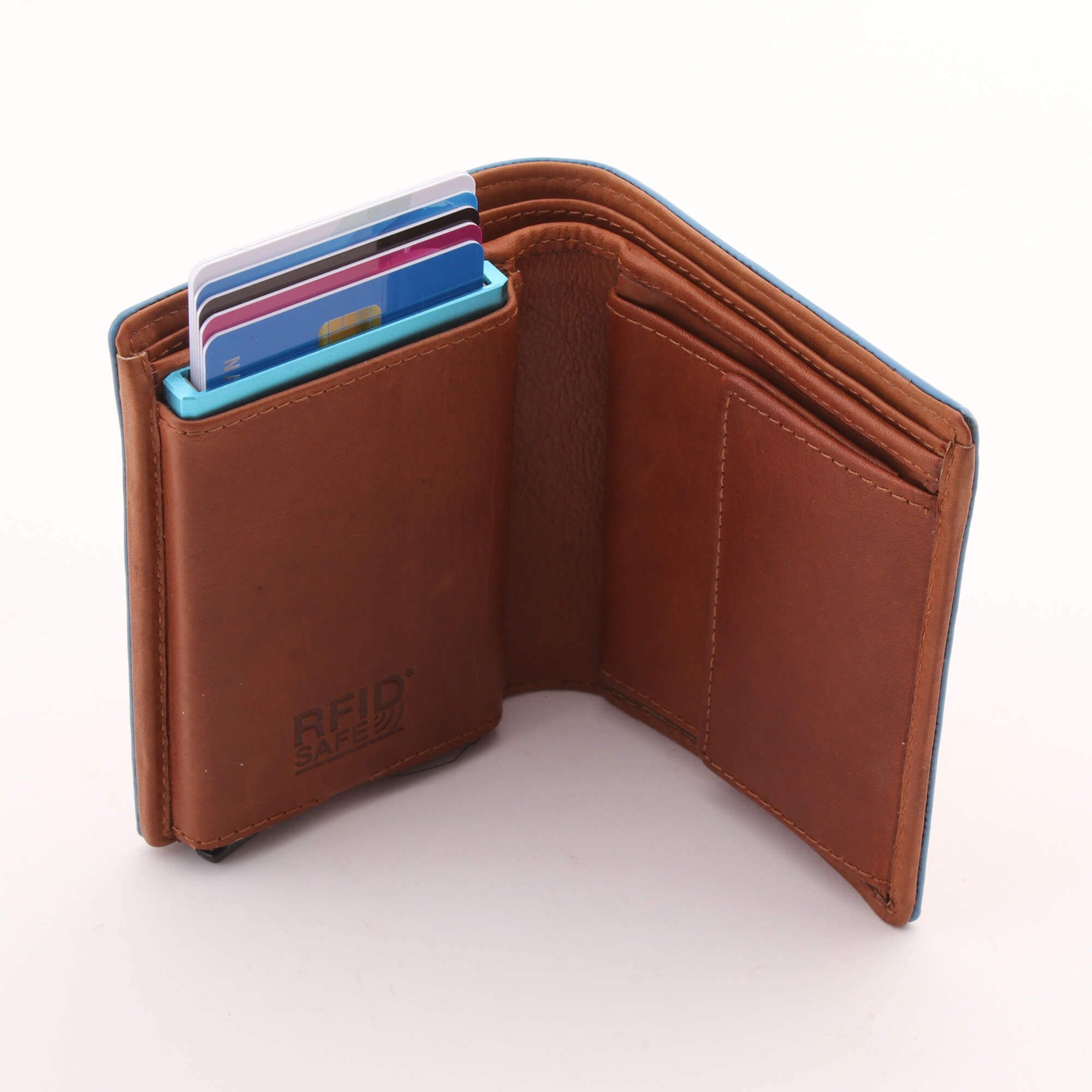 Deze leren klapportemonnee met ruimte voor negen passen en de nodige bankbiljetten is de nieuwste versie van GAZ die is voorzien de befaamde card protector. Deze aluminium protector beschermt uw pasjes optimaal, tegen zowel buigen en breken, als tegen het ongewenst uitlezen van RFID-kaarten. Denk daarbij aan uw ID-kaart, OV-chipkaart of creditcards en bedrijfspassen. In deze protector kunt u maar liefst zes kaarten opbergen, met een kleine klik aan de onderzijde schuiven de pasjes overzichtelijk omhoog en kunt u eenvoudig het benodigde pasje eruit halen. In de portemonnee zit verder een muntvakje met drukker en twee vakken voor biljetten.