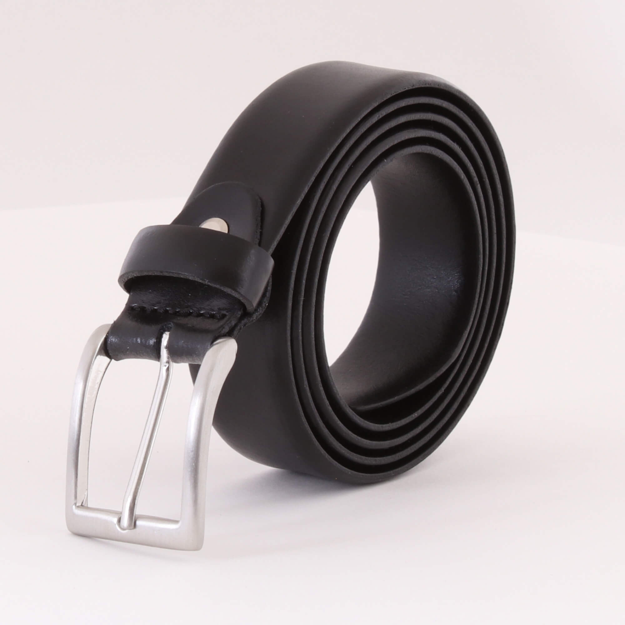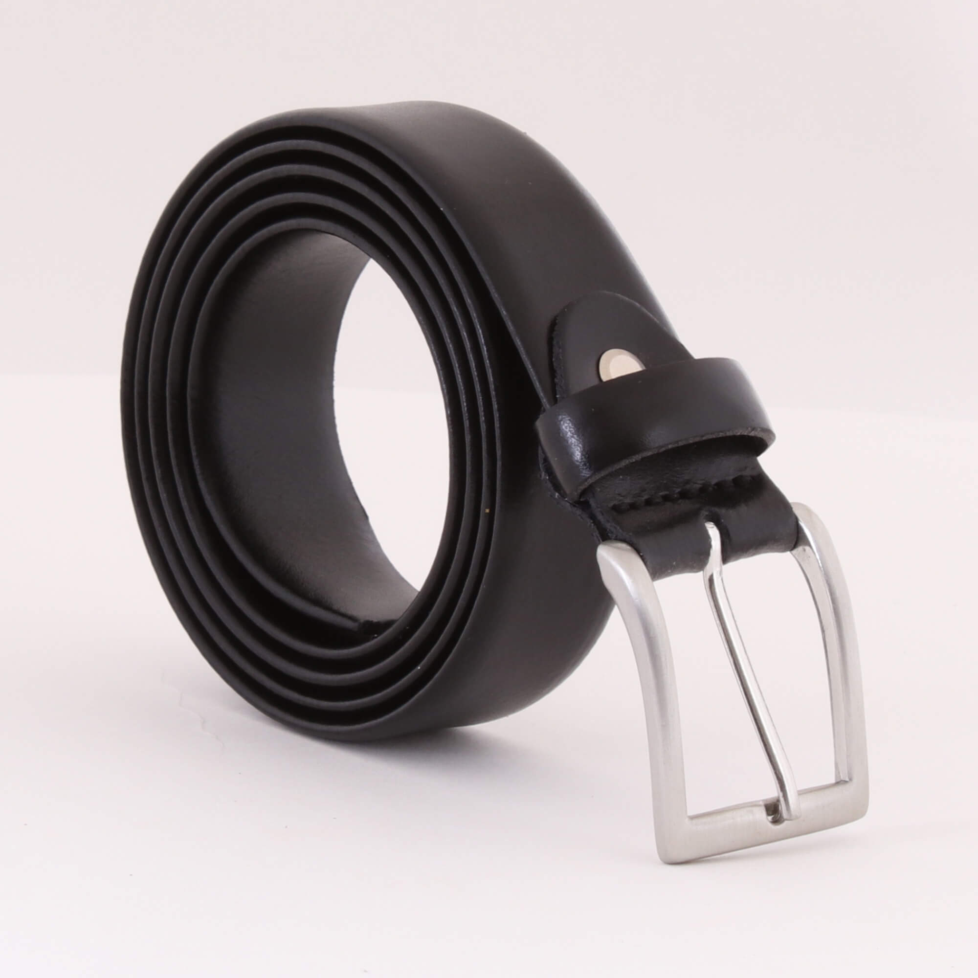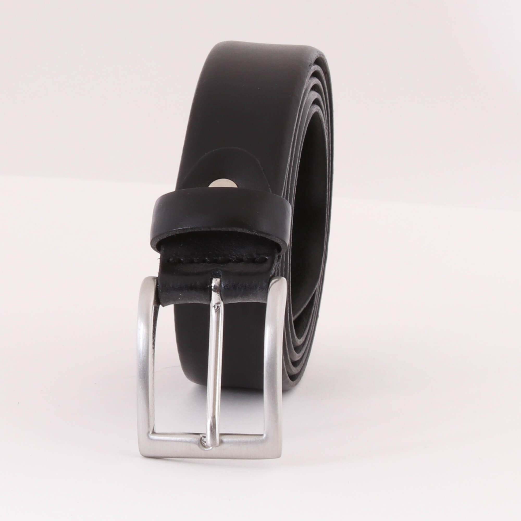 Deze zwart lederen ceintuur heeft zowel aan de voor- als achterzijde een gladde afwerking. De randen zijn eveneens afgerond en dat komt de chique uitstraling van deze riem alleen maar ten goede. De zilverkleurige, rechthoekige gesp is door een verstelbare schroef eventueel te verstellen.